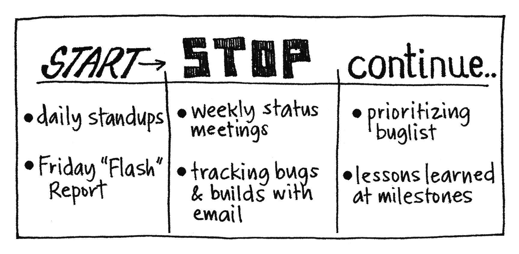 The start stop continue retrospective is an action-oriented retrospective style generating an immediate list of practical ideas for continuous improvement. STOP List thingsbehaviors being done that that are not working Iwe should STOP. Offering Pre-K childcare on.